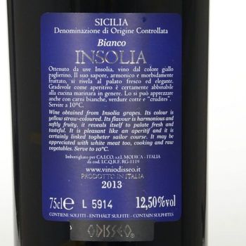 Insolia D.O.C. die Odisseo keller ist ein Weißwein mit strohgelber Farbe und einem harmonischen und sanft fruchtigen Geschmack. In der Nase ist Insolia Odisseo fruchtig, intensiv und anhaltend. Insolia Odisseo hat einen Alkoholgehalt von 12,5% Vol. Und eine Alterungsfähigkeit von 2/3 Jahren. Es wird bei 10 ° serviert, kann als Aperitif oder zu einer Mahlzeit aus Fisch, weißem Fleisch, Marinaden, Rohkost oder Gemüse verzehrt werden. Insolia Odisseo ist ein Wein, der in seinem Geschmack und seiner Farbe die Essenz des Landes, in dem er geboren wurde, hervorbringt und seine Ausstrahlung voll zum Ausdruck bringt.